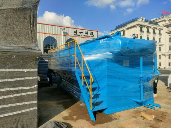 溶氣氣浮機采用新型的溶氣設(shè)備——微氣泡發(fā)生器,代替?zhèn)鹘y(tǒng)的引氣設(shè)備向水中溶氣,并在氣浮區(qū)域內(nèi)安裝若干斜管組,包括箱體、刮渣機、螺旋出料機共同組成一個完整氣浮凈水裝置。當(dāng)懸浮物的密度大于1時,由于安裝了斜管組,就會產(chǎn)生淺池沉淀的效果,從而使沉淀在紊流條件下進行。粒徑教大、比重教大的不易上浮的污染物質(zhì)就會集中到集泥區(qū)里,達到凈水的目的。